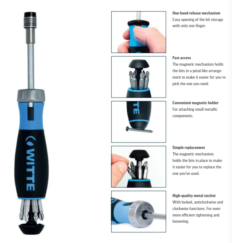 Desarmador con 6 puntas PRO BITDRIVE RATCHET incluye 6 piezas. PH1 25mm. PH2 25mm. PH3 25mm. PZ1 25mm. PZ2 25mm. PZ3 25mm.