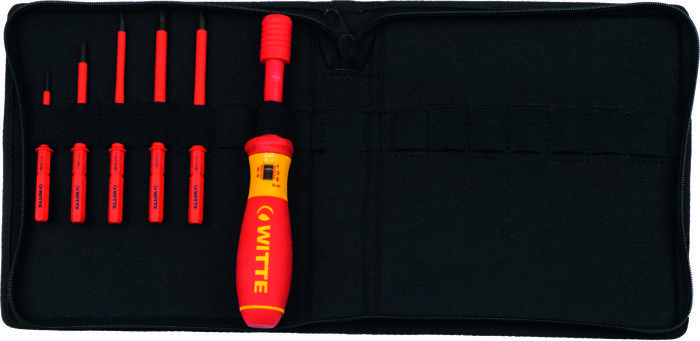 Desarmador de pares de torsión VDE para pare de 1,0-5,0 Nm. Con 5 varillas remplazables en estuche enrollable: PH2 100mm. PH1 80mm, Plano 0,5x0,3mm 60mm, Plano 0,8x4,0mm 80mm, Plano 1,0x5,5mm 80mm.