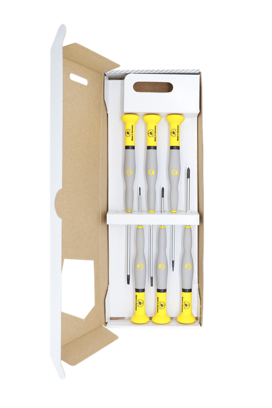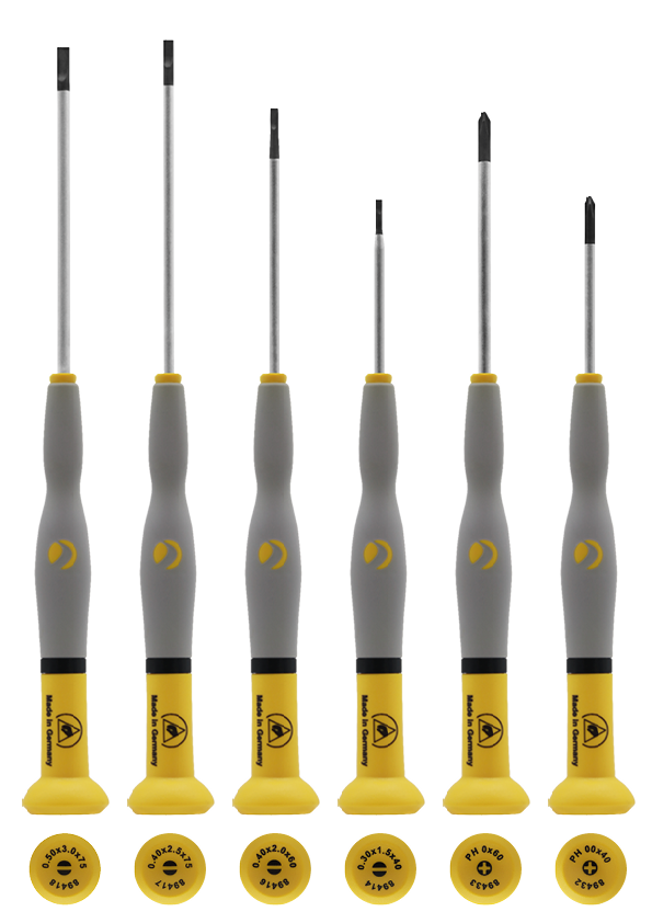 Juego de desarmadores PRO WITTRON ESD Plano/Cruz Incluye 6 piezas. 0,3 x 1,5mm. 0,4 x 2,0mm. 0,4 x 2,5mm. 0,5 x 3,0mm. PH 00 2,5mm. PH 0 3,0mm.
