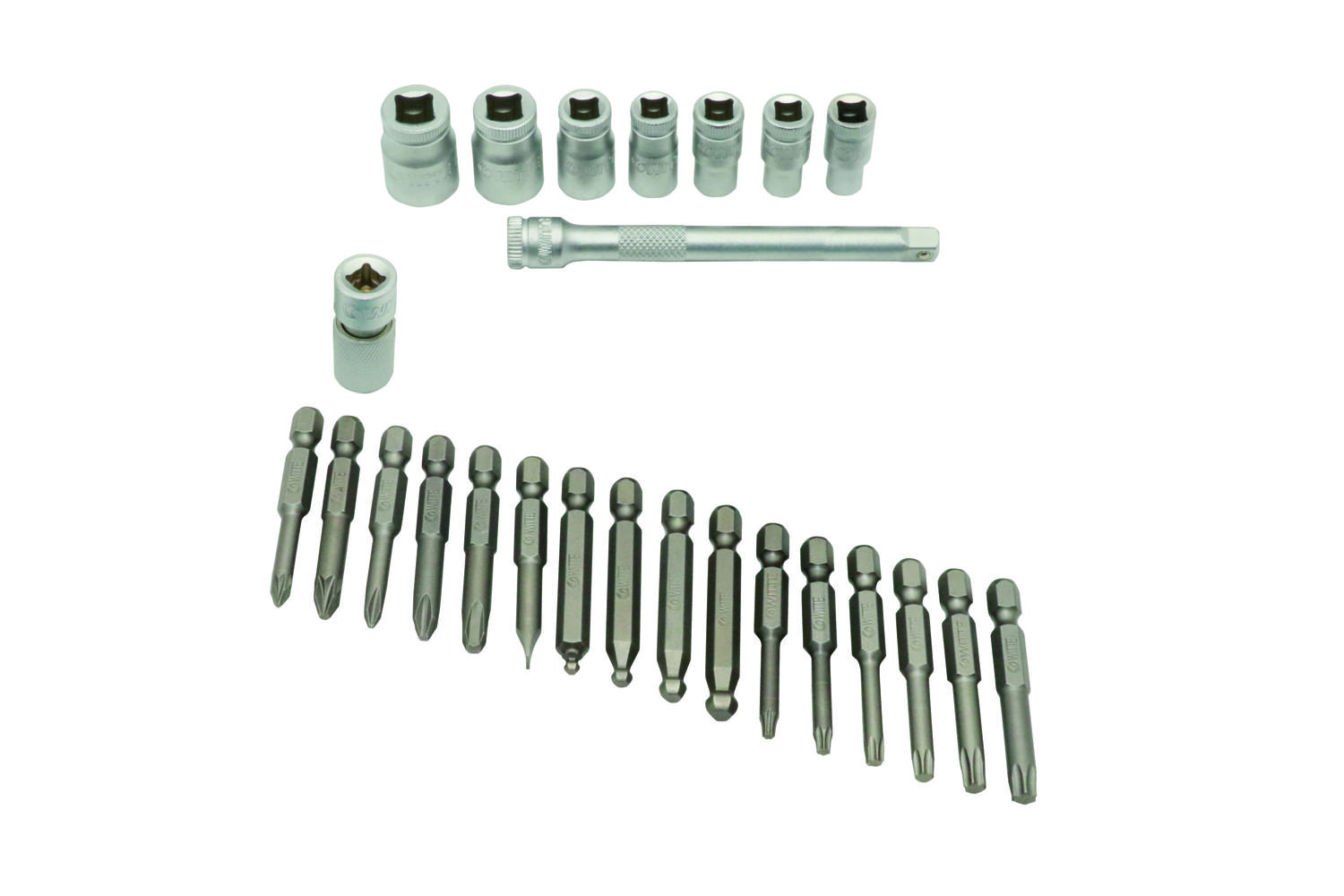 Juego de 26 piezas: 7 vasos hexagonales/ 16 puntas Planas,Pozidriv,Phillips,Hexagonal, Torx/ 1 adaptador de puntas 1/4" x 32mm/ 1 extensión de 1/4" x 100m/ 1 matraca con cabeza giratoria de 1/4"